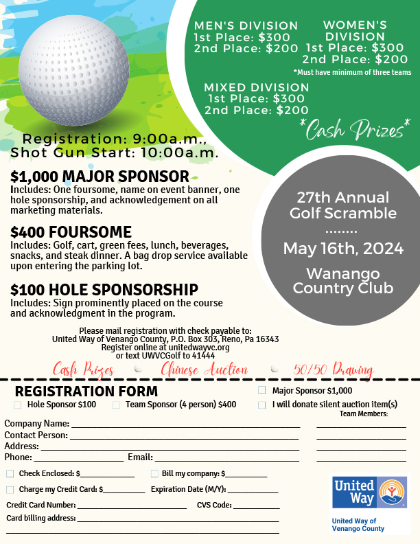 United Way of Venango County’s 27th Annual Golf Scramble will be held on May 16, 2024.